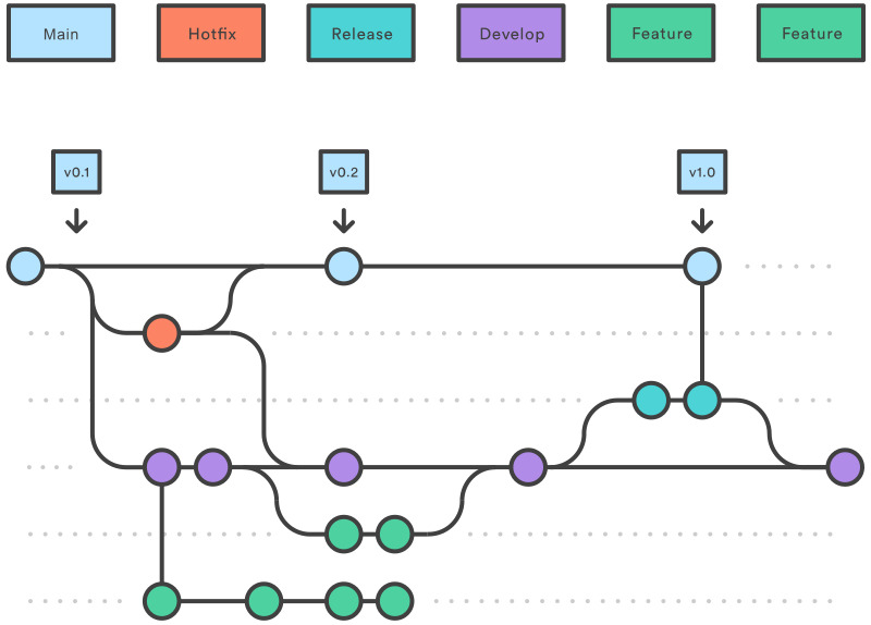 feature브랜치들은develop에서 분기합니다.develop브랜치는 개발의 중심입니다.release브랜치는develop에서 분기하여 준비 후master로 병합됩니다.hotfix브랜치는master에서 직접 분기하여 긴급 수정 후 다시master로 병합됩니다.